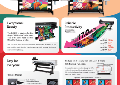 The TS330 Series is a dye sublimation inkjet printer achieving superb productivity and high image quality through Mimaki printing technology. Designed on a new platform, the printer incorporates improved conveyance mechanism and renewed usability, enabling stable and constant high-quality printing.