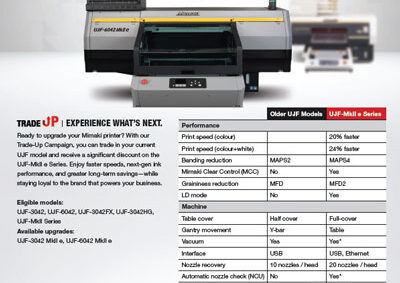 Ready to upgrade your Mimaki printer? With our Trade-Up Campaign, you can trade in your current UJF model and receive a significant discount on the UJF-MkII e Series. Enjoy faster speeds, next-gen ink performance, and greater long-term savings—while staying loyal to the brand that powers your business